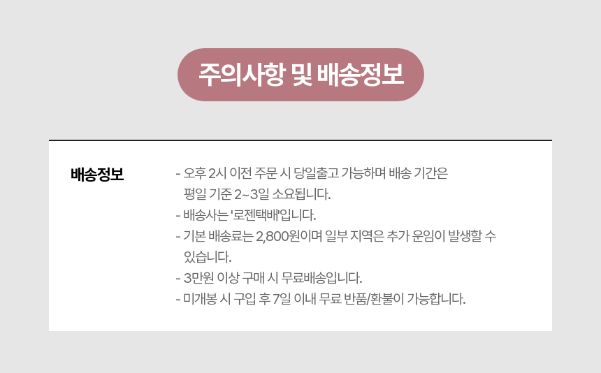- 구매자 사정으로 교환이나 환불을 할 경우 왕복 배송료는 구매자 부담이며, 상품에 이상이 있거나 잘못